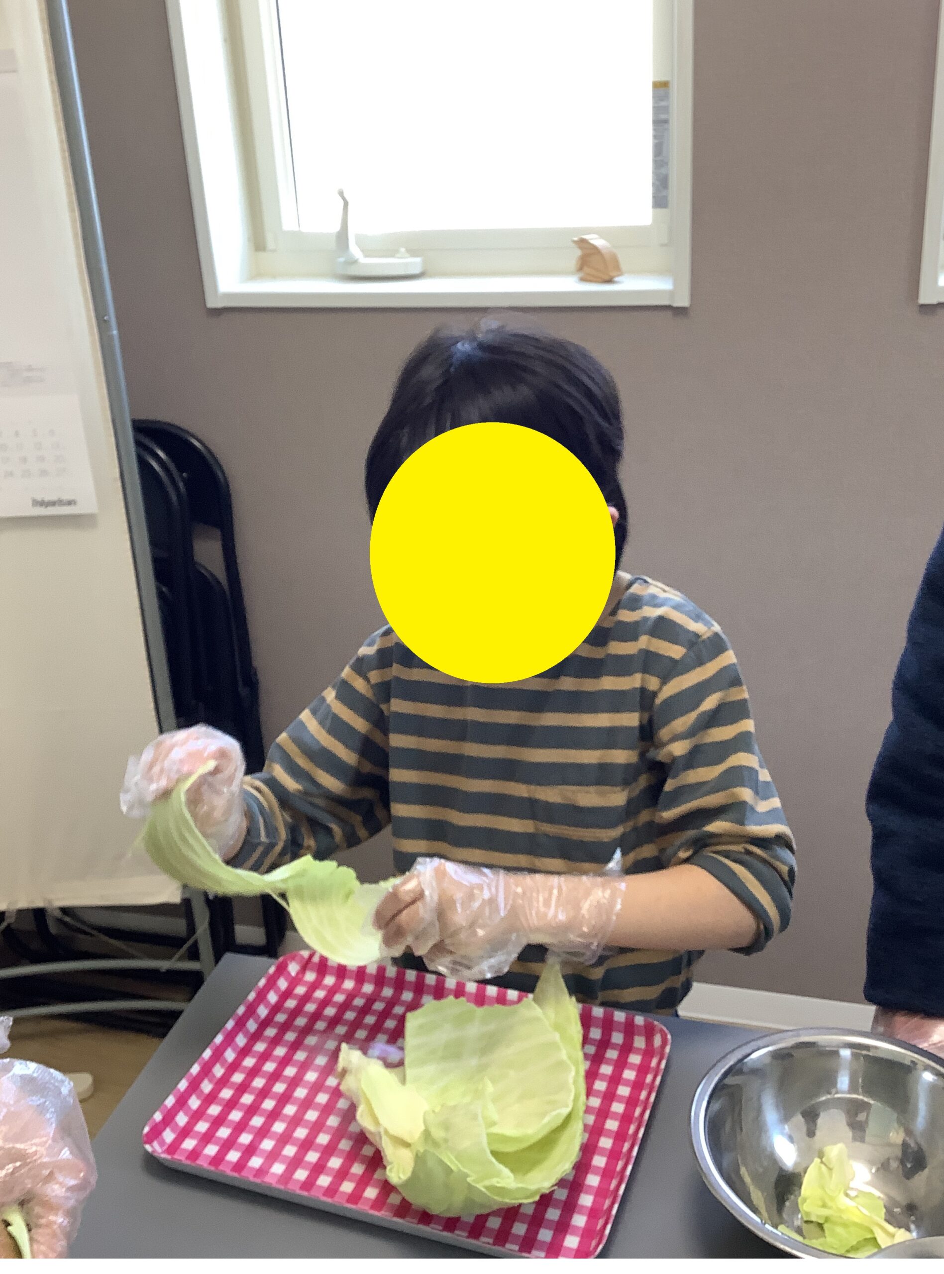 キャベツ切りの練習を学校で行っているMさんには包丁で、NさんとSさんには手でキャベツを一口大にカットしてもらいました。